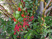 | センリョウや南天の赤い実がとて も鮮やかで、おめでたい雰囲気を 出しています。 |